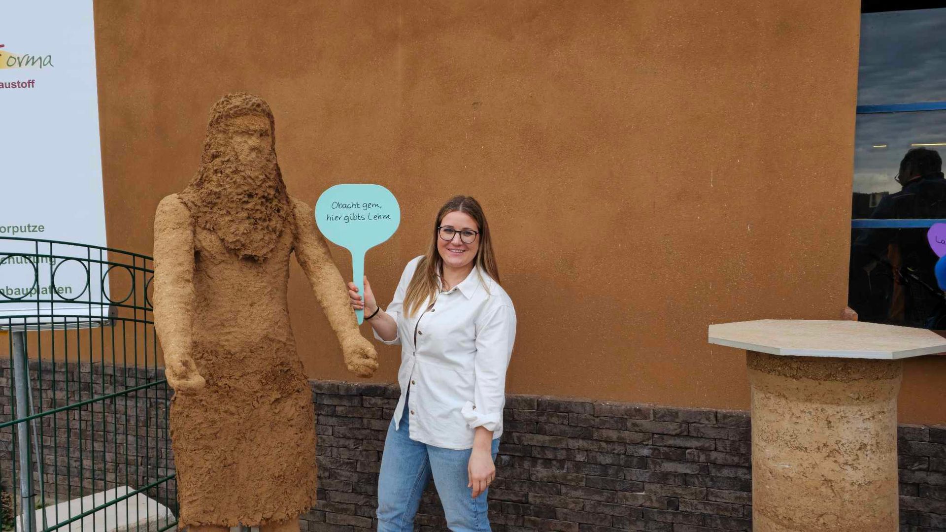 Nina Oberst von Götzenkunst hat diese Wand entworfen. Die Lehm-Selfie-Wand stellt die Elemente dar, die für die Verarbeitung von Lehm benötigt werden.